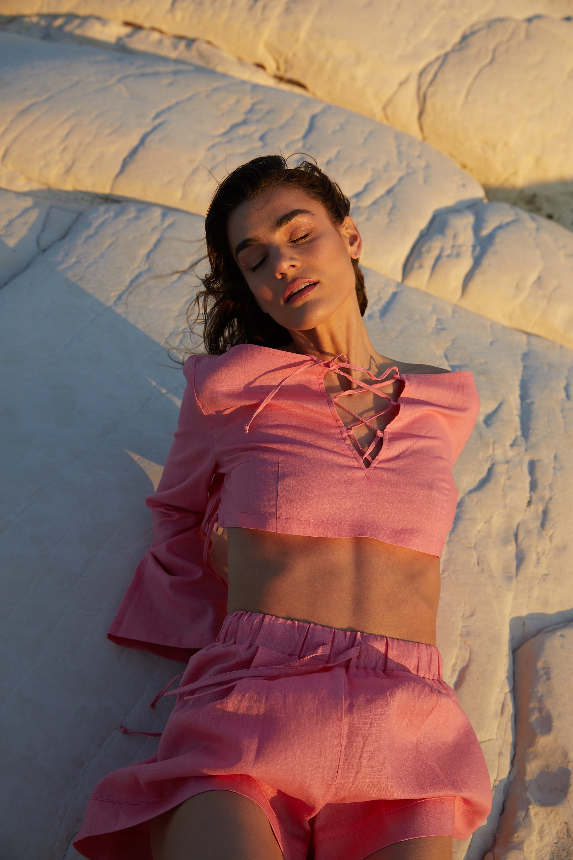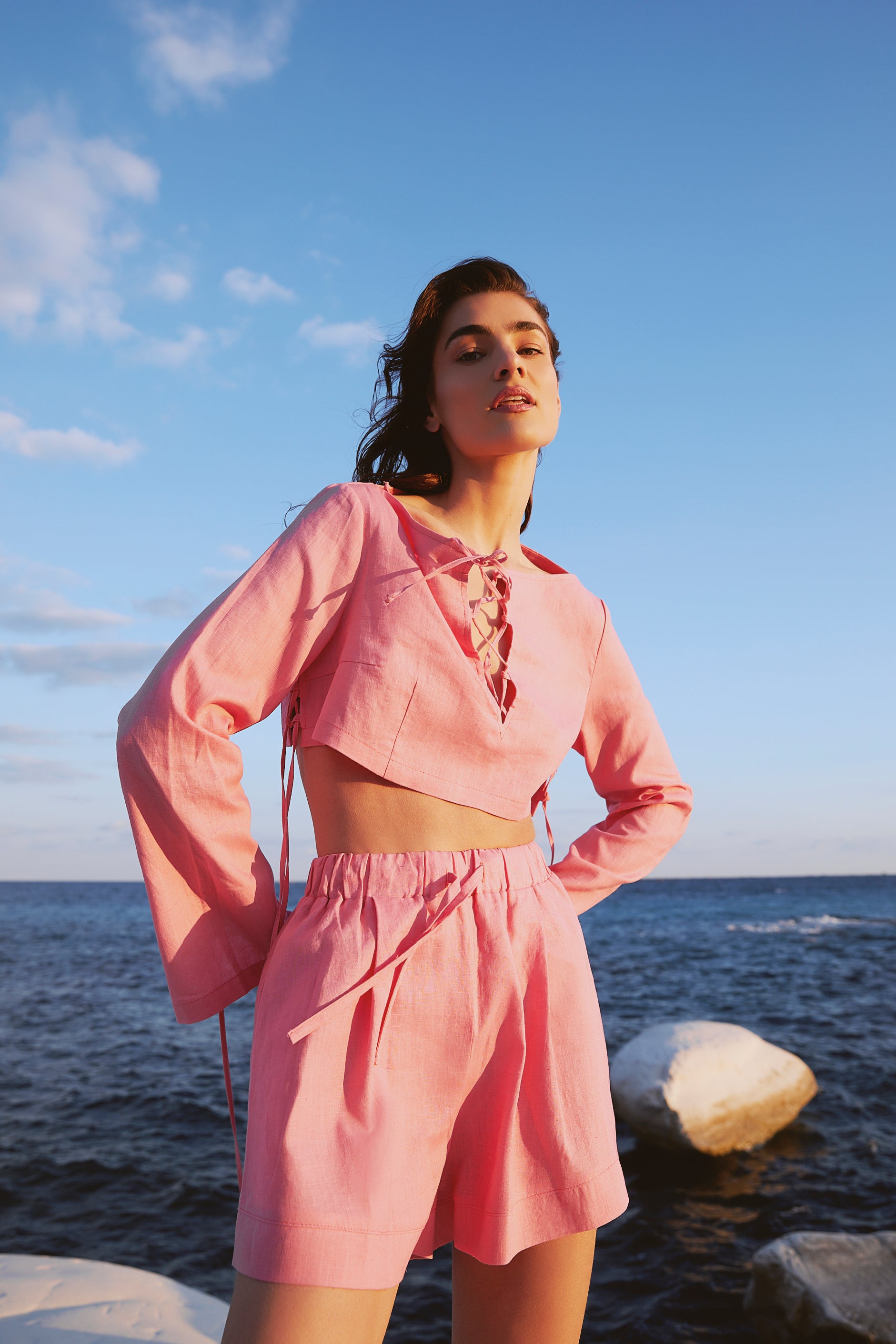 Linen set featuring a skirt, shorts, and a top with accent lacing, available in various colors